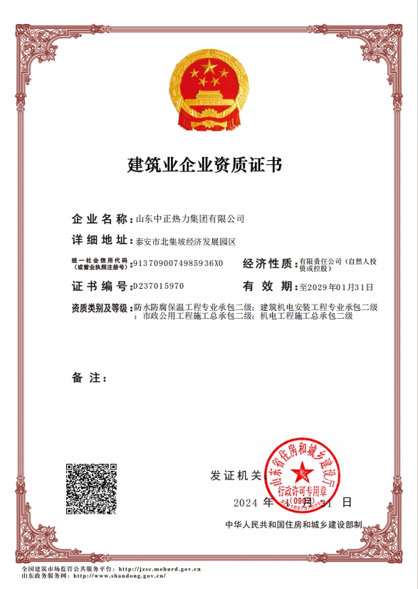 機(jī)電工程施工總承包二級、市政公用工程施工總承包二級、建筑機(jī)電安裝工程專業(yè)承包二級、防水防腐保溫工程專業(yè)承包二級